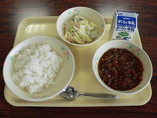 献立は、ハヤシライス、マカロニサラダでした。ハヤシライスは、ソースがまろやかで、タマネギがとろとろに煮込んであり、こくがありました。マカロニサラダは、野菜がシャキシャキで、マカロニやハムの甘みがマヨネーズでさらに増し、ハヤシライスとの相性も抜群でした。とてもおいしかったです。
