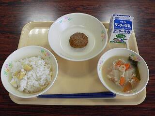 献立は、須木の栗ご飯、鶏肉と根菜のつくね、厚揚げの味噌汁でした。栗ご飯は、甘くて大きい須木栗がたくさん入っており、季節を感じました。つくねは、タマネギやゴボウ、にんじんなどたくさんの根菜がはいりさくさくした食感で、鶏肉の甘みがありました。味噌汁は、味噌の加減もよく、厚揚げに汁がしみこんでいました。