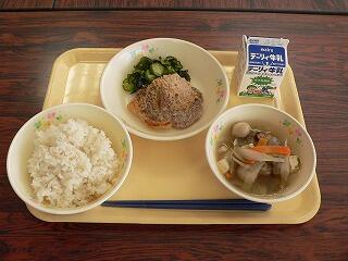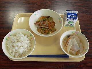 今日は【地産地消献立】です。献立は、麦ご飯、いわしのおかか煮、いんげんのごま和え、京芋のみそ汁です。いわしは、骨まで柔らかく煮てあり、甘辛い味付けで、おかかの味も加わって美味しいです。いんげんは、素材の味とほのかなごまの風味がよく合います。みそ汁は、サイの目にカットされた京芋の他に、にんじん、大根、わかめ、油揚げなど具だくさんです。味加減もちょうどよく、美味しくいただきました。