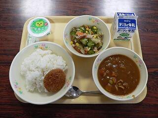 献立は、カツカレー、りっちゃんサラダ、リンゴゼリーでした。今日のメニューは、細野小のリクエスト献立でした。子どもたちの大好きなカレーに、カツまで付いた豪華版でした。サラダは、1年生の国語の教科書に載っている「サラダでげんき」に出てくる「りっちゃんサラダ」でした。ゼリーまで付いた豪華なメニューに、子どもたちも大喜びでした。