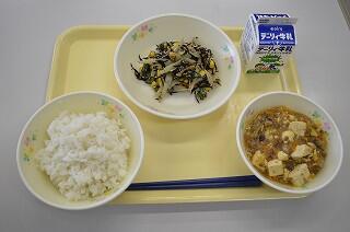 献立は、麦ご飯、マーボー豆腐、ひじきとごぼうのサラダです。マーボー豆腐は、豆腐やひき肉がたくさん入っています。細かくきざまれたにんじん、椎茸、たけのこなど具材もたくさんで、みそ味が効いて美味しいです。サラダは、ごぼう、ひじき、きゅうり、コーンなどが入っています。ツナ水煮の味とよく合います。