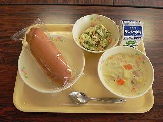 献立は、コッペパン、シーフードチャウダー、ごまマヨネーズ和えでした。シーフードチャウダーは、魚貝の旨味たっぷりのクリーミィな味わいで、ジャガイモなどの野菜がとても甘く感じました。ごまマヨネーズ和えは、野菜の味がごまとマヨネーズで引き立てられていました。パンや牛乳と一緒に、おいしくいただきました。