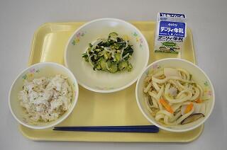 献立は、梅菜めし、きつねうどん、ほうれん草のごま和えです。ごはんには、小さくきざんだ梅や青菜が入っています。梅の酸味が心地よく広がります。きつねうどんは、細く切った油揚げや鶏肉などが入っています。つるつるとこしのある麺にだしがよく合います。和え物は、ほうれん草やきゅうり、もやし、たまごなどが入っています。すりごまの風味が良く、ひんやりとして美味しいです。