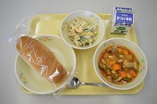 献立は、ミルクパン、豚肉のトマト煮、さつまいもサラダです。煮物は、野菜、きのこ、豆など具だくさんで、トマトの酸味が効いたさわやかな一品でした。サラダは、さつまいもの甘味が感じられ、とても美味しかったです。
