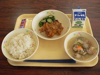献立は、麦ご飯、がね、キュウリのしらす和え、豚汁、鰹のふりかけでした。郷土料理『がね』は、衣がさくさくで、サツマイモとタマネギの甘みを感じました。しらす和えは、しらすの塩味とゴマの風味が効いていました。豚汁は、里芋がほくほくで、心も体も温まる一品でした。ご飯に、鰹のふりかけをかけて、どれもとてもおいしくいただきました。