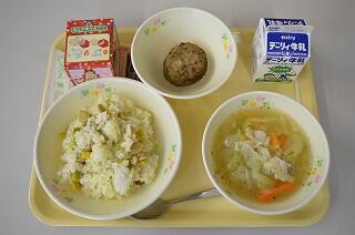 今日は、2学期前半の最終日ということで、子どもたちが楽しみにしていた【クリスマス献立】です。メニューは、メキシカンライス、ハンバーグ、ポテトスープ、ブッシュ・ド・ノエル・・・と豪華です。ウインナーや青豆が入ったメキシカンライスは、スパイシーな味付けで美味しいです。ハンバーグは、分厚く肉の味も濃厚です。ポテトスープは、キャベツ、人参、玉ねぎ、ベーコンなどの旨みが凝縮されています。デザートのブッシュ・ド・ノエルは、切り株の形をしたケーキで、クリームがたっぷり入っています。今年最後の給食でしたが、とても美味しくいただきました。