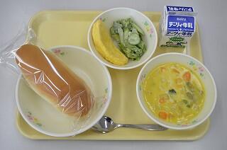 今日は【冬至献立】です。ちなみに今年の冬至は12月22日です!献立は、ミルクパン、トマトミートオムレツ、アスパラサラダ、パンプキンシチューです。オムレツは柔らかく、中に入ったミートソースの味も美味しいです。アスパラサラダは、ドレッシングの爽やかな味付けで素材の美味しさが引き立ちます。シチューは、カボチャの他に人参、グリンピースなどが入って色鮮やかです。まろやかで、塩味がきいています。柔らかいミルクパンと美味しくいただきました。