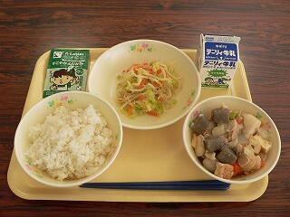 献立は、麦ご飯、豚肉と大根の味噌煮、キャベツのゴマ酢和え、ふりかけでした。味噌煮は、食べやすい大きさにカットされた野菜などの具材が、柔らかく煮込んであり、味噌の香ばしい味がしみこんでいました。ゴマ酢和えは、さっぱりとしたゴマ風味たっぷりの和え物でした。ご飯をのりの風味が効いたふりかけでいただきました。おいしかったです。