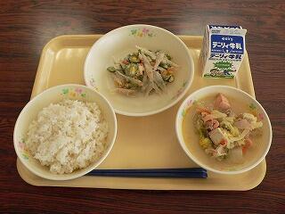 献立は、麦ご飯、北海寄せ鍋、ごぼうサラダでした。鍋は、鮭の風味たっぷりの具だくさん寄せ鍋で、心も体も温まりました。ごぼうサラダは、噛みごたえもあり、かむほどにごぼうの甘みが増しました。おいしくいただきました。