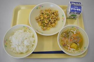献立は、鶏そぼろ丼、かねんしゅいです。そぼろ丼は、鶏肉の他にきざんだ大豆もたくさん入っています。たまごや人参、グリンピースも入っていて彩りがよく美味しいです。かねんしゅいは、甘く柔らかいサツマイモのもちや野菜が入っています。そぼろ丼との相性も抜群で美味しいです。