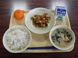 献立は、麦ご飯、シイラのたこ焼きソースからめ、こばっこ味噌汁、みかんでした。今日は、地産地消献立で、こばっこ味噌汁の中に、小林市で生産量の多いほうれん草、大根、人参が入っていました。シイラもカラッと揚がっていて、甘辛のたこ焼きソースがかかり、ご飯が進みました。健康によい青豆が付いていたこととデザートのミカンもうれしかったです。おいしくいただきました。