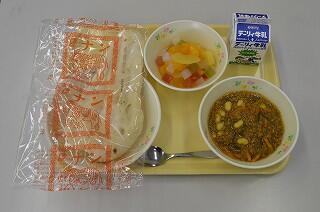 献立は、ナン、キーマカレー、フルーツポンチです。キーマカレーということで、ひき肉がたっぷりで、ピーマン、にんじん、大豆などにチーズも入って味がまろやかです。小麦粉で作られたナンと一緒に美味しくいただきました。フルーツポンチは、赤や緑のゼリーが入っていて色鮮やかで、ナタデココがコリコリとしています。フルーツが、シロップの甘い味にからんでとても美味しいです。