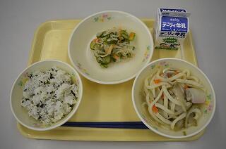 献立は、わかめご飯、五目うどん、ちりめんの酢の物です。ご飯は、わかめの風味が良く、塩味が効いて美味しいです。酢の物は、大根、きゅうり、にんじんが入っています。ちりめんやごまの味がして美味しいです。うどんは、ごぼうや鶏肉などいろいろな具が入っていて味も抜群です。寒い日ですが、体が温まります。