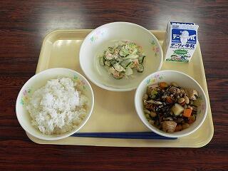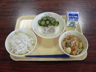 献立は、麦ご飯、厚揚げの中華煮、シューマイ、かっぱ漬けでした。中華煮は、厚揚げの他に肉やイカ、うずらの卵、たくさんの野菜が入っており、味がしみていました。シューマイは、肉の旨味が詰まっていました。かっぱ漬けは、ほどよい味加減で鰹節の風味も効いていました。おいしくいただきました。