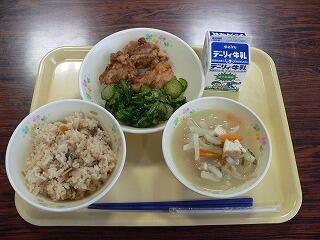 献立は、五目炊き込みご飯、鶏の唐揚げ、味噌汁、ほうれん草のごま和えでした。今日のメニューは、きりしま支援学校のリクエスト献立でした。炊き込みご飯は、香ばしい香りが特徴的でした。唐揚げは、カラッと揚がっていて鶏肉も柔らかく、味もスパイスがきいていました。味噌汁は、具だくさんで、味噌の風味に大根や人参の甘みが感じられました。ほうれん草の和え物は、さっぱりした味にゴマの風味が効いていました。おいしくいただきました。