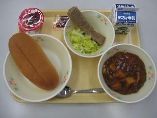 献立は、セルフドッグ、ビーフシチュー、一色ソース、イチゴのハートプリンです。セルフドッグは、ドッグパンに歯ごたえのよいキャベツと柔らかいスティック型のハンバーグを挟んで、ソースをかけて美味しくいただきました。シチューは、じゃがいもや牛肉がたくさん入っていて、濃厚な味で美味しいです。バレンタインデーということで、ハート型でイチゴ味のプリンも最後に美味しくいただきました。