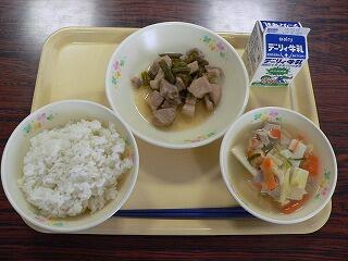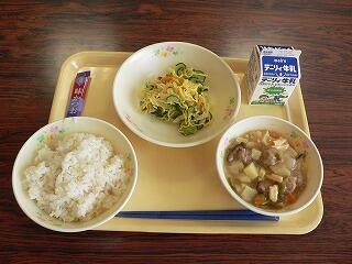 献立は、いりこ菜飯、がね、甘酢和え、米粉のだご汁でした。いりこ菜飯は、塩味が丁度よく、青菜がよく混ざっていました。郷土料理のがねは、カラッと揚がっていて歯ごたえもよく、中のサツマイモやタマネギの甘みがありました。甘酢和えは、甘くさわやかで、大根や人参にごまがたっぷりとかかっていました。だご汁は、もちもちの団子と具だくさんのおいしい味でした。おいしくいただきました。