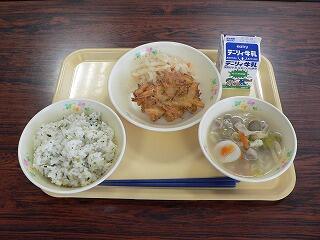 献立は、五目炊き込みご飯、鶏の唐揚げ、味噌汁、ほうれん草のごま和えでした。今日のメニューは、きりしま支援学校のリクエスト献立でした。炊き込みご飯は、香ばしい香りが特徴的でした。唐揚げは、カラッと揚がっていて鶏肉も柔らかく、味もスパイスがきいていました。味噌汁は、具だくさんで、味噌の風味に大根や人参の甘みが感じられました。ほうれん草の和え物は、さっぱりした味にゴマの風味が効いていました。おいしくいただきました。