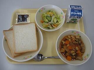 献立は、食パン、チョコクリーム、豚肉のトマト煮、日向夏ドレッシング和えです。トマト煮は、豚肉や人参が一口大の食べやすい大きさです。大豆いんげんしめじなどたくさんの具材がトマトソースにからんで美味しいです。ドレッシング和えは、野菜が新鮮でコーンやハムが入っています。日向夏の味がとても爽やかで美味しいです。