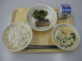 献立は、麦ご飯、さんまのかぼすレモン煮、きゅうりのおかかあえ、かき玉汁です。さんまは骨まで柔らかく、かぼすレモンの味がほのかに広がります。きゅうりは、歯ごたえが良く、おかかとの相性も抜群です。かき玉汁は、ほうれん草や玉ねぎなど野菜がたくさんで、たまごで甘味が増して美味しいです。