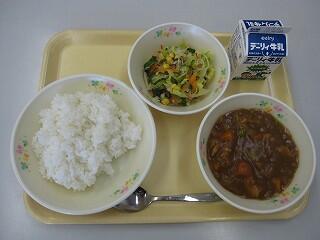 献立は、チキンカレー、いろどり和えです。カレーは、じゃがいも、人参、玉ねぎの他にグリンピースがたくさん入っています。鶏肉が柔らかくコクがあって美味しいです。和え物は、赤黄緑と色鮮やかで、野菜とかまぼこの味がよくなじんでいて美味しいです。