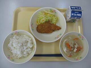 献立は、麦ご飯、鮭のチーズフライ、せんキャベツ、千切り大根のみそ汁です。フライは、表面がカリッとして、中はチーズがとろとろです。青のりの風味もあり美味しいです。添え野菜は薄味で、キャベツの甘味をとても美味しく感じます。みそ汁は、千切り大根の他に、ほくほくの里芋やサイコロ大の厚揚げがたくさん入っていて美味しいです。
