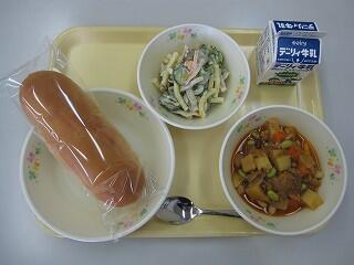 献立は、コッペパン、野菜と豆のミートソース、マカロニサラダです。ミートソースは、レンズ豆、ひよこ豆、えんどう豆と豆類や一口大の野菜がたくさんで、ミートソースの味が良くなじんで美味しいです。サラダは、マカロニのほかにきゅうりや人参、ハムなどが入っています。マヨネーズの味付けで食べやすく美味しいです。