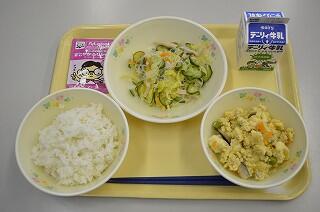 献立は、ポークカレー、りっちゃんサラダ、お祝いケーキでした。カレーは、豚肉の甘みとこくのあるルーが他の具材やご飯と絡んで、とてもおいしかったです。カレーの後味に、さっぱりさわやかなりっちゃんサラダもうれしかったです。卒業のお祝いに、ケーキが登場し、子どもたちも大喜びでした。
