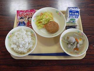 献立は、麦ご飯、キャベツのメンチカツ、1食ソース、添え野菜、鶏ゴボウ汁、ひなあられでした。メンチカツは、さくさくの衣の中に旨味たっぷりの豚挽肉が入り、濃厚ソースをたっぷりかけていただきました。ごぼう汁は、里芋・ごぼうなどの根菜がよく煮てあり、鶏肉の出汁がよく効いていました。おいしくいただきました。
