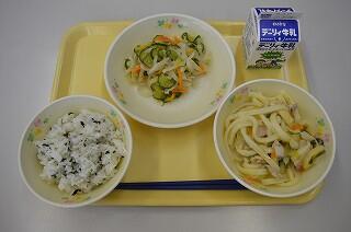 献立は、わかめご飯、みそ煮込みうどん、ちりめんの酢の物です。ご飯は、わかめに塩味が効いています。うどんは、鶏肉が柔らかく、野菜や椎茸などが入っていてみその味がよくしみ込んでいます。酢の物は、すりごまの風味が良くちりめんの味とよく合います。美味しくいただきました。