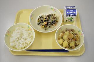 献立は、麦ごはん、肉じゃが、かみかみサラダです。肉じゃがは、一口大のほくほくのジャガイモや厚揚げの他に豚肉やこんにゃくなどがたくさん入っていています。今日のように肌寒い日は特に美味しく感じます。サラダは、ひじきやコーン、人参などで色合いが良いです。つな水煮の味が効いて、きゅうりやゴボウの歯ごたえがよく、たくさん噛んでおいしくいただきました。