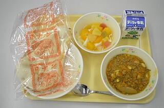 献立は、ナン、キーマカレー、フルーツあんにんです。キーマカレーは、たっぷりのひき肉に細かくカットされた人参やピーマン、大豆、ひよこ豆などがたくさん入っています。スパイスが効いたカレーとナンを一緒に美味しくいただきました。あんにんどうふは、もも、みかん、パインや、いろどりの良いゼリーが入っています。果物の酸味にシロップの甘味が良く調和して美味しいです。