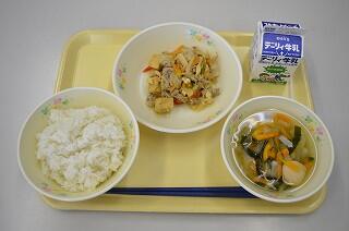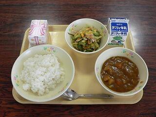 献立は、ポークカレー、りっちゃんサラダ、お祝いケーキでした。カレーは、豚肉の甘みとこくのあるルーが他の具材やご飯と絡んで、とてもおいしかったです。カレーの後味に、さっぱりさわやかなりっちゃんサラダもうれしかったです。卒業のお祝いに、ケーキが登場し、子どもたちも大喜びでした。