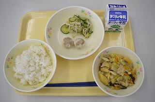 献立は、麦ご飯、八宝菜、シューマイ、もやしナムルです。八宝菜は、キャベツ、たけのこ、人参の他に豚肉やいか、うずらの卵など具だくさんです。ヤングコーンは歯ごたえもよくいい味がします。シューマイは、肉の旨みが凝縮されています。ナムルは、新鮮で歯ごたえのあるもやしときゅうりにごまの風味が加わってとても美味しくおすすめです。