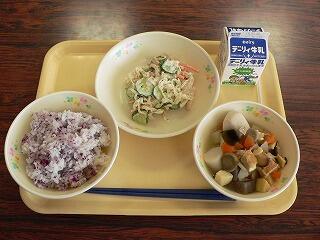 献立は、ゆかりごはん、煮しめ、千切り大根のマヨネーズ和えでした。ゆかりご飯は、しその風味が豊かで、煮しめをおかずにご飯が進みました。煮しめは、具材に味がしみこんでいました。千切り大根のマヨネーズ和えは、大根の風味も十分にあり、キュウリや人参もさくさくとした食感でした。おいしくいただきました。