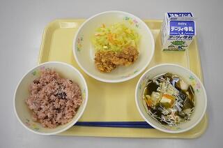 今日は【卒業お祝い献立】です。献立は、赤飯、鶏肉の唐揚げ、添え野菜、すまし汁です。唐揚げは、味がしっかりついていておいしいです。添え野菜は、キャベツや人参にかわいい星型のチーズがアクセントとなって見た目も味も最高です。すまし汁は、出汁がよく出ています。わかめやえのきの他にふわふわのはんぺんも入っています。赤飯は、小豆の味が絶妙でとても美味しいです。