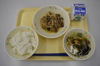 献立は、麦ご飯、いり豆腐、春雨サラダ、ふりかけです。いり豆腐は、豆腐やたまごの他に鶏肉や細切りの人参、たけのこが入っています。甘い味付けで美味しいです。春雨サラダは、キャベツ、きゅうりなど野菜とハムがたくさん入っています。春雨の冷たい食感が美味しいです。ご飯はふりかけで美味しくいただきました。