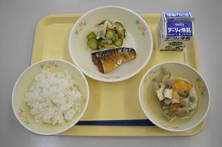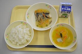 献立は、麦ご飯、さわらの野菜あんかけ、かぼちゃのみそ汁です。さわらは、玉ねぎや人参など野菜の入ったとろとろのあんがかかっています。魚の美味しさを引き立ててくれます。みそ汁は、里芋や人参も入っています。かぼちゃの甘味が口の中に広がって美味しいです。