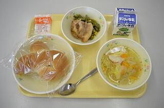献立は、黒糖パン、鶏肉の照焼き、いんげんのソテー、ラビオリスープ、ミルメークです。鶏肉は、柔らかく中まで味がよくしみています。いんげんも柔らかく、コーンの甘味も加わって美味しいです。スープは、野菜の旨みでいっぱいです。ラビオリも柔らかく美味しいです。パンは、ふっくらとして口に含むと黒糖の味が広がります。牛乳には久しぶりのミルメークを入れて美味しくいただきました。