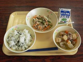 献立は、麦ご飯、肉野菜炒め、ご汁でした。野菜炒めは、豚肉や野菜が醤油で炒めてあり、香ばしく素材の甘みが感じられました。ご汁は、大豆の甘い香りがして、里芋などの具材も柔らかく煮てありました。とてもおいしくいただきました。