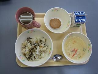 献立は、わかめご飯、鶏肉の味噌ころばかし、千切り大根和えでした。わかめご飯は、塩加減も丁度よく、わかめの磯の香りがしました。味噌ころばかしは、味噌の風味が具材全体にしみていて、ご飯が進みました。和え物は、野菜のシャキシャキした食感と千切り大根の香りがマッチし、ツナが良い味を出していました。