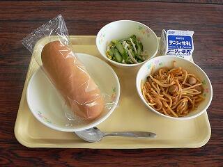 献立は、コッペパン、スパゲティナポリタン、アスパラサラダでした。スパゲティは、ケチャップ味が懐かしいナポリタンで、ウインナーも入り、ボリュームがありました。サラダは、丁度よい酸味のさわやかな味で、アスパラやキュウリ・コーンの甘みが感じられ、ハムが味を調えていました。おいしくいただきました。