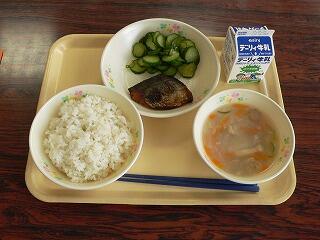 献立は、麦ご飯、サワラの西京焼き、かっぱ漬け、米粉のだご汁でした。西京焼きは、香ばしい醤油の味付けで、おいしかったです。かっぱ漬けは、ごま油の香りがして、キュウリもサクサクでした。だご汁は、懐かしい味わいで、鶏肉の出汁が効いていました。おいしくいただきました。