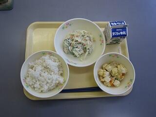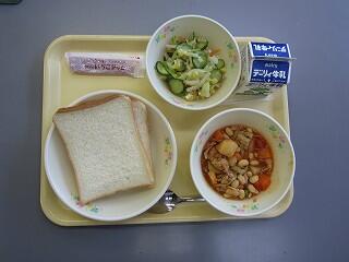 今日の献立は、食パン、イチゴジャム、ポークビーンズ、チーズサラダです。今日はまず、チーズサラダの中に入っているチーズの形が星型でとってもかわいいなあと思いました。野菜の中にお星様がいっぱいでおいしさも増しました。ポークビーンズは、豆がたくさん入っていて、豆の味もおいしく感じました。今日も美味しくいただきました。