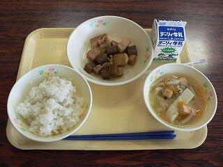 献立は、麦ご飯、豚肉の甘辛煮、ほうとう汁でした。甘辛煮は、豚肉が醤油味の甘辛いたれで炒めてあり、ご飯にとてもよく合いました。ほうとう汁は、大分県の郷土料理で、煮込んだほうとうが他の具材とよく絡み、独特の味わいがありました。とてもおいしくいただきました。