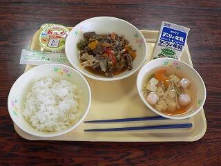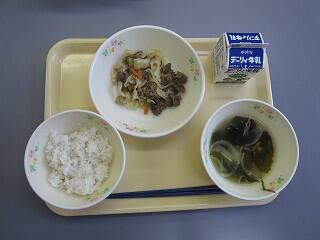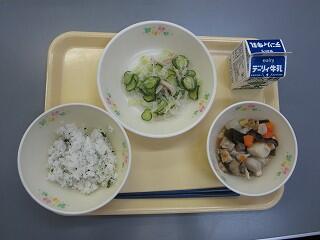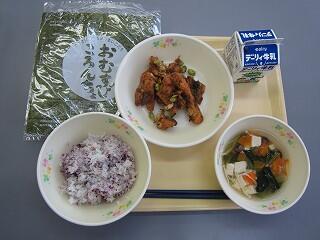 今日の献立は、ジャンボおにぎり、しいらのたこやきソースからめ、きのこじるです。ジャンボおにぎりは、のりの上にしそご飯をのせ、巻いて食べます。低学年にとっては大きなおにぎりだったと思いますが、自分で巻いて食べる楽しみがありました。しいらのたこ焼きソースからめは、お魚にたこ焼きソースが意外と合っていてびっくりしました。今日も美味しくいただきました。