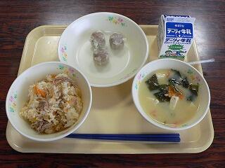 献立は、キムタクご飯、ポークシューマイ、ご汁でした。キムタクご飯は、ご飯と具材がよく混ぜられてあり、辛みも丁度よく、食欲がわきました。シューマイは、柔らかくもちもちの食感で、豚肉の甘みが感じられました。ご汁は、大豆の甘みと香りが汁全体に広がり、味噌の濃さも丁度よかったです。おいしくいただきました。