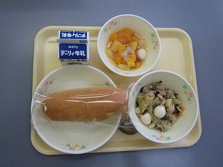 今日の献立は、コッペパン、八宝菜、フルーツ白玉です。八宝菜は、筍、ヤングコーン、キクラゲ、キャベツ、うずらの卵など、具だくさんで、食感もよく美味しかったです。フルーツ白玉は、フルーツにゼリー、白玉と、見た目もカラフルでしたが、さっぱりとした味で、今日のような暑い日にはもってこいのデザートでした。今日も美味しくいただきました。
