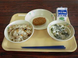 今日は、地産地消献立でした。小林市で生産量の多いほうれん草、大根、人参を使った「こばっこ味噌汁」と肉じゃがコロッケ、混ぜご飯でした。おいしくいただきました。