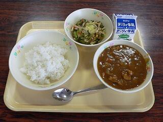 献立は、チキンカレー、りっちゃんサラダでした。チキンカレーは、具材も柔らかく煮てあり、カレーの辛みも丁度よかったです。りっちゃんサラダは、おかかが入っており、子どもたちにも食べやすいサラダになっていました。おいしくいただきました。